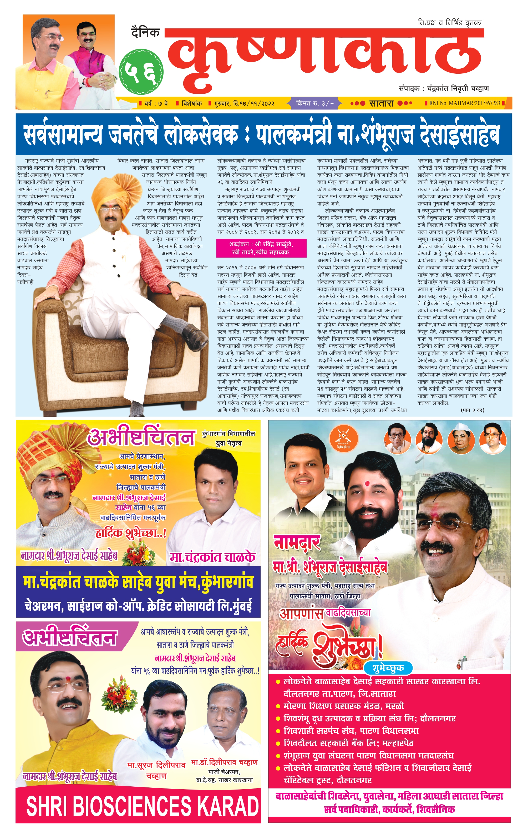 विधानसभेतील मुलुखमैदान तोफ, पाटण तालुक्याचा बुलंद आवाज, विकासाचा महामेरू, विकासाचे वादळ अशी अनेक बिरुदे असलेले पाटणचे लोकप्रिय आमदार राज्याचे उत्पादन शुल्क मंत्री व राज्यातील महत्त्वपूर्ण अशा सातारा व ठाणे जिल्ह्याचे पालकमंत्री अशी राजकारणात व समाजकारणात यशाची शिखरे पादाक्रांत करणारे संसदपटू नामदार शंभूराज देसाई यांचा 17 नोव्हेंबर हा जन्मदिन आज त्यांचा 56 वा वाढदिवस या जन्मदिनाचे औचित्य साधून दैनिक कृष्णाकाठ ने त्यांच्या कार्याचा घेतलेला हा आढावा.